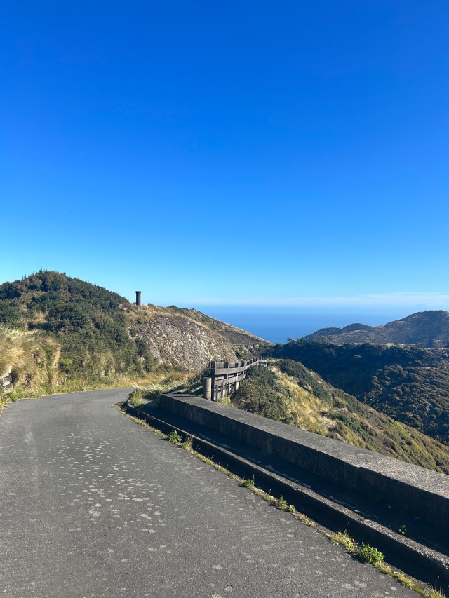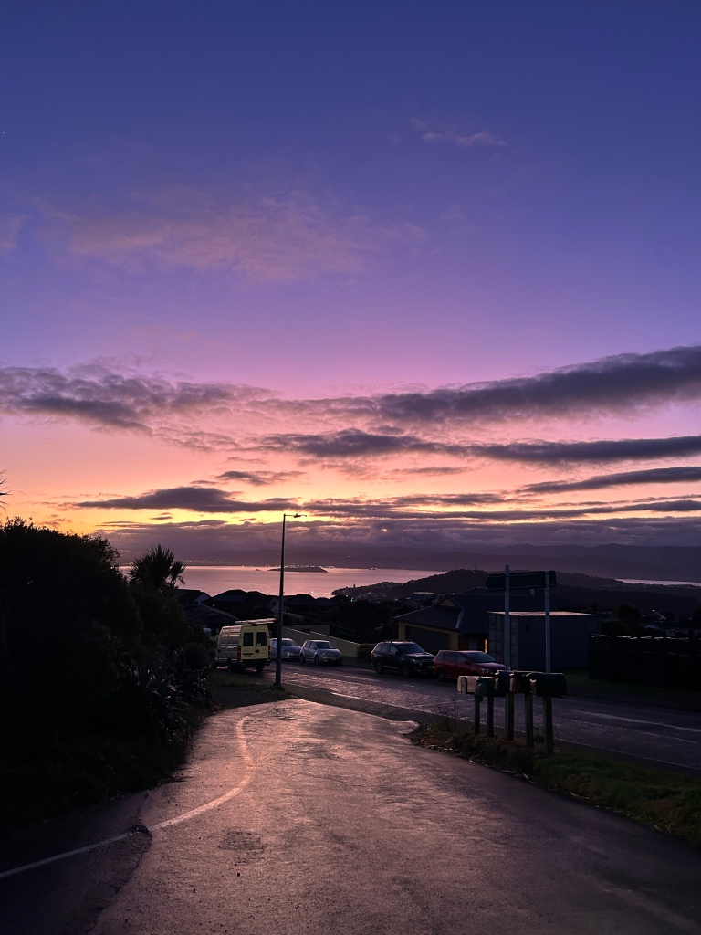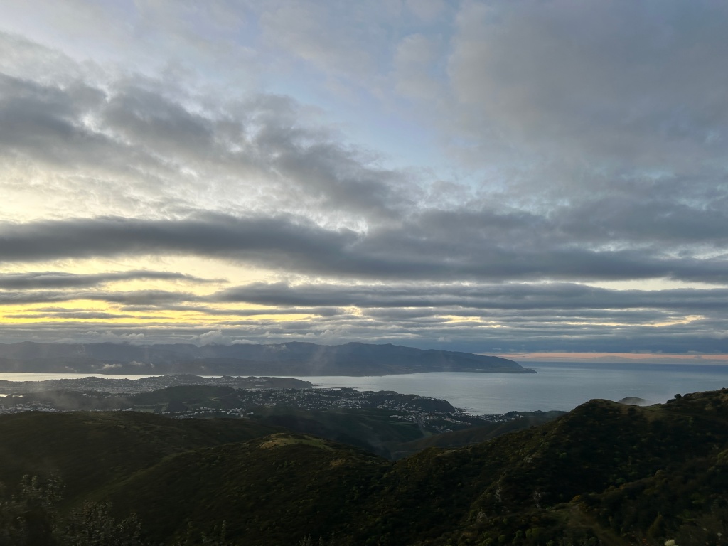 Breath and steam swirling in the beam of my front light as I inched up Helen and Apuka and Karepa. The sky was becoming a pinky peach – I think of this colour as ‘Ezibuy Peach’, as I remember a lot of the tracksuits and t-shirts in the catalogue in the 90s were called ‘Peach’ or sometimes ‘Terracotta’. All variations on washed-out orange.