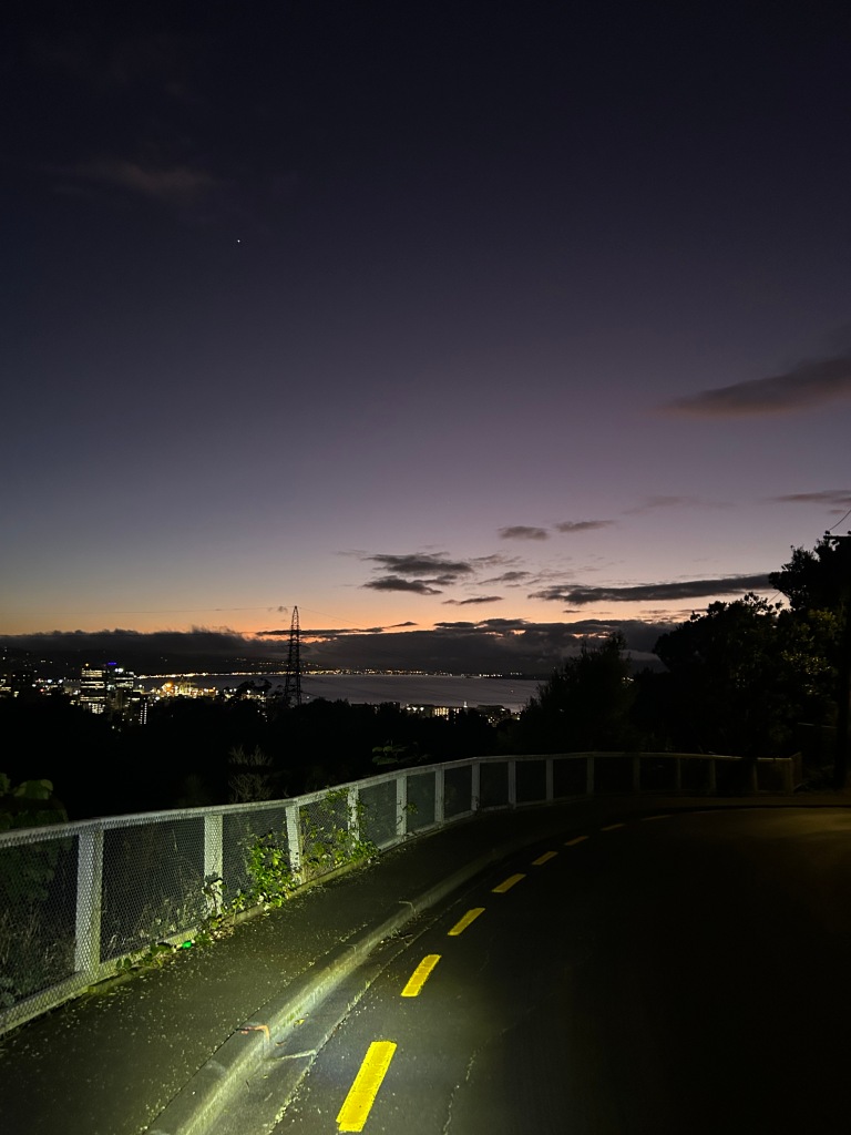 Got up just after 6, splashed face with cold water, put on a hi-vis vest and my most hideous and comfortable shorts, and attempted a Big Ride. A morepork was still out, and the moon and stars. Shockingly, some people striding along in business clothes already. Roads otherwise quiet, sky only just starting to lighten. I had an idea that maybe I could make it up to the Golf Ball and still make it to work in time. Zoomed down into Aro then up Durham, towards Brooklyn. (As always, I could’ve gone along Highbury Fling, but I really like to start this climb right from the bottom.) I am always amazed at how quickly I start roasting, even in chilly morning air. After about thirty seconds of steep climbing, I’m ready for an ice bath.